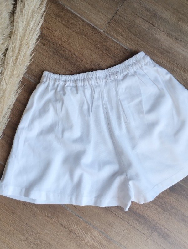 Short de lino sastrero, con tres tablas por lado bolsillos laterales, cintura delante recta y atras con elástico para mejor ajuste.