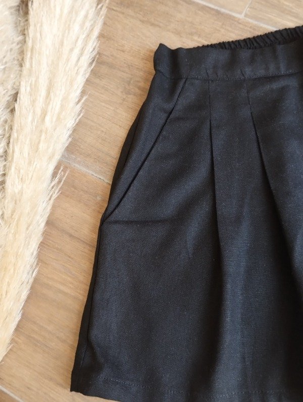 Short de lino sastrero, con tres tablas por lado bolsillos laterales, cintura delante recta y atras con elástico para mejor ajuste.